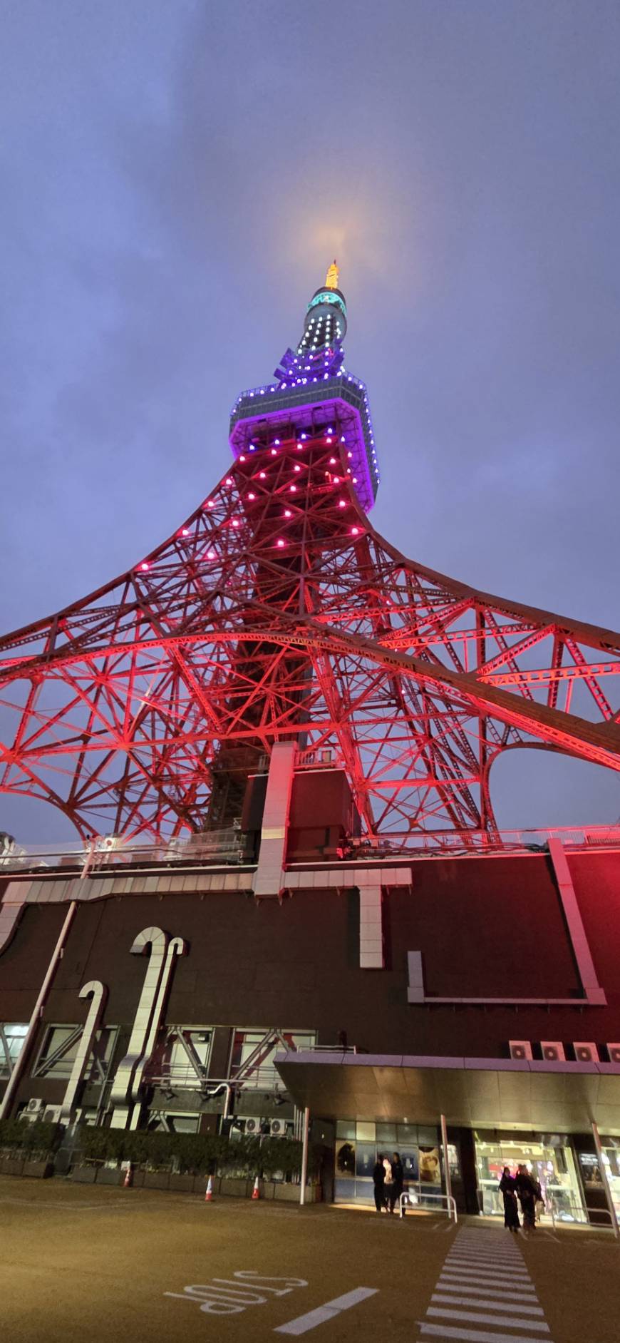 東京タワーでは曇り空でしたが、都会の景色を高い所から眺め、また透明な床から下を覗くと足が竦むような高所からの絶景を体験しました。当日限定のライトアップもとても綺麗でした。