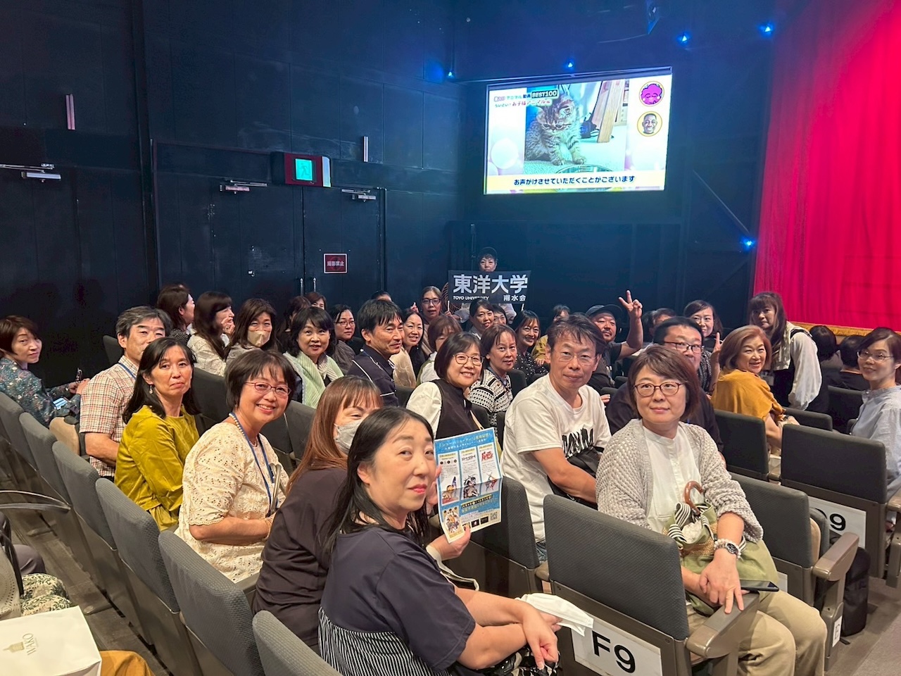 ランチ会場から観劇会場の新宿駅ルミネ2に移動し、「ルミネtheよしもと」に入場です。チケット完売、満席で立ち見も出る中、今回は全員で前方座席を確保でき、開演前にはフクロクジュさん(福島出身の若手芸人コンビ)による前説でライブに入る気持ちを高めていただき…いざスタート!