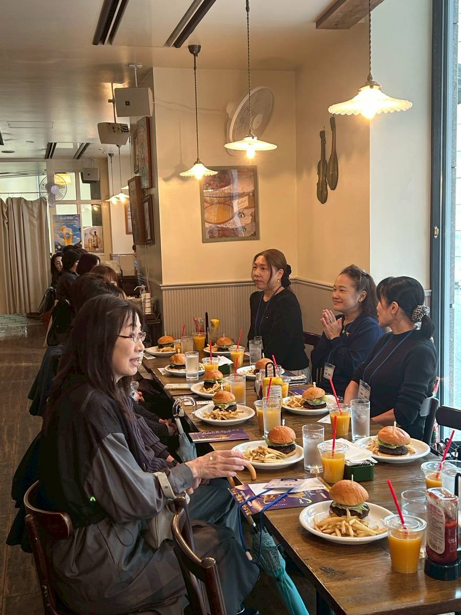 観劇前には、近くの人気レストラン「バビーズ」にてランチ懇親会を行いました。こちらのレストランは、ニューヨーク発祥のアメリカ家庭料理が有名なお店です。今回は人気メニューのハンバーガーとアップルパイを用意していただき、各々のテーブルで楽しい会話と食事を楽しみました。