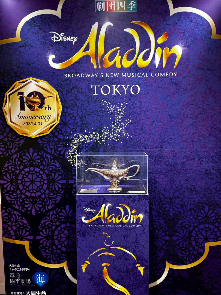 そして場所を劇団四季の電通四季劇場“海”に移動し、ロングラン上演中の【アラジン】の観劇です!ストーリーはご存じのとおり、ホール・ニュー・ワールド(新しい世界へ)“自由”を求め、大いなる“希望”を胸に、“未来”へと向かうアラジンの物語です。