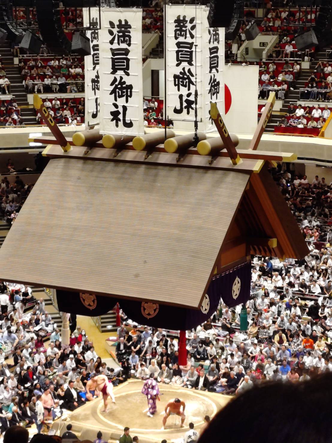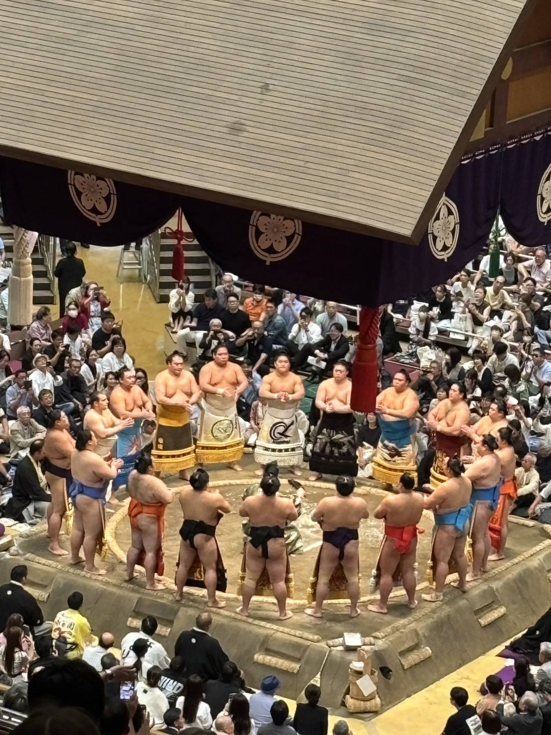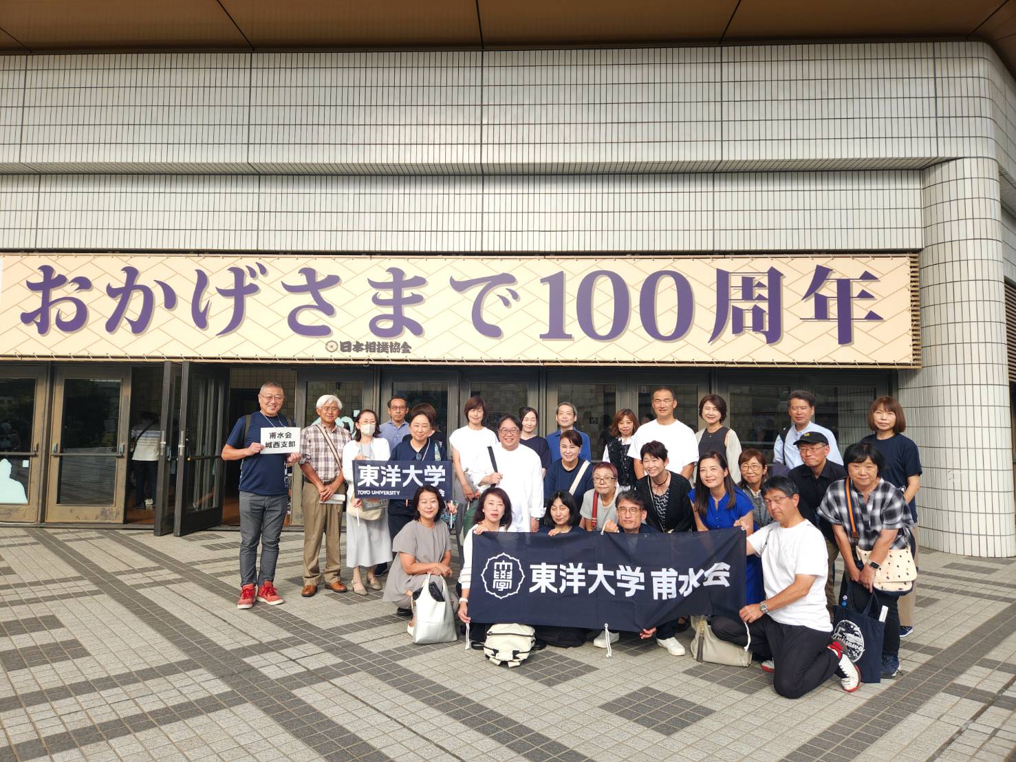 集合写真の撮影を終えた後は満員御礼の会場に移動、熱気に包まれワクワクしながらの観戦となりました。国技館名物の焼鳥をいただきながら土俵で繰り広げられる一番ごとの取り組みに見入り、圧倒的没入感を味わうことができました。終盤、東洋大学出身の若隆景関の取り組みでは応援にも特に熱が入り、東洋大学の横旗を胸元で広げ、皆で声援を送りました。