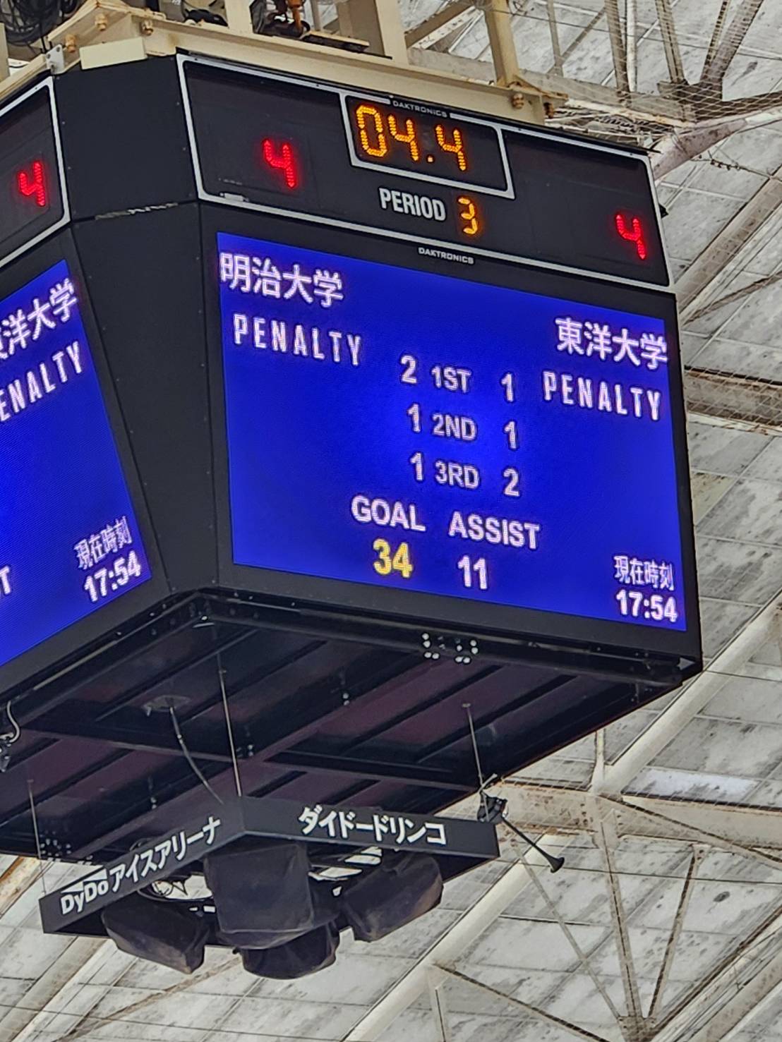 延長戦(3対3のサドンデス方式)でも決着はつかず、勝負はペナルティーショットへ。5人ずつの対決でも決まらず、最後はサドンデス方式のペナルティーショットに突入。東洋大学が見事なセーブを見せた直後、決勝ゴールを決めて劇的な勝利を収めました。
