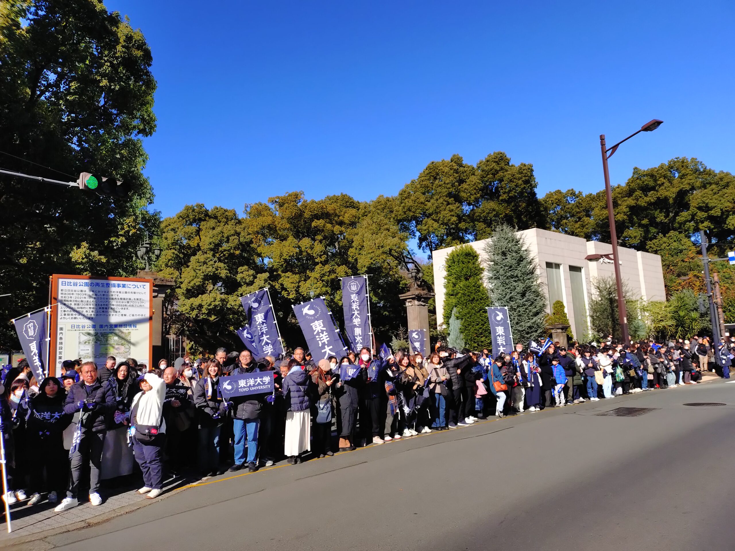 往路16位で、復路は一斉スタートとなってしまった東洋大学ですが、各区間とも全力の素晴らしいパフォーマンスを見せてくれ、日比谷公園前を風のように走り抜け、会員も皆声を張り上げ、メンバーの名前を叫び、一生懸命応援しました。14位と、惜しくもシードを逃してしまいましたが、今後の頑張りを期待しつつ、甫水会会員の気持ちを一つにしてくれました。