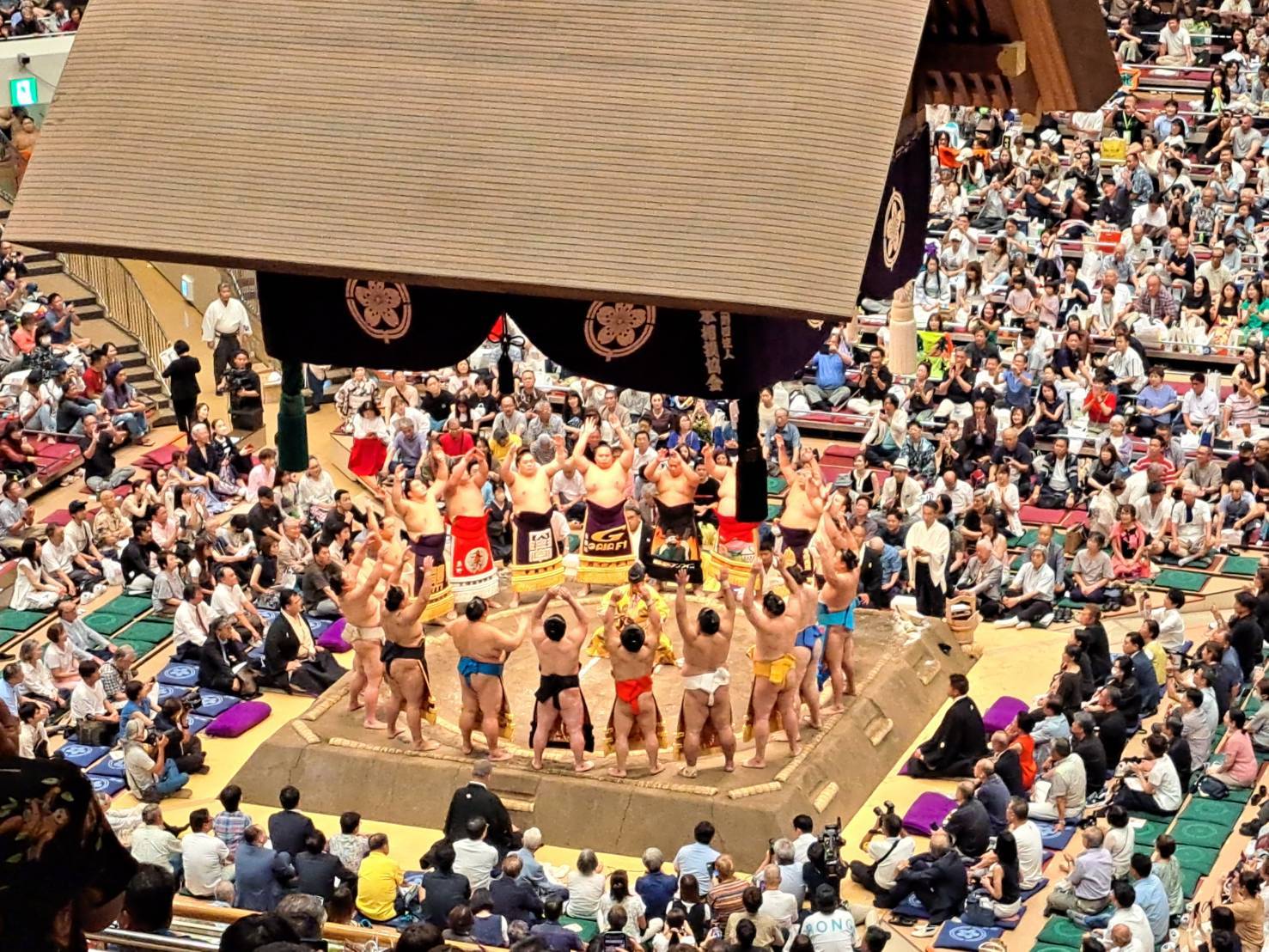 中入り後には、満員御礼の垂れ幕が下りて拍子木の音とともに化粧まわしをつけた幕内力士達の土俵入り、そして東西横綱の土俵入り、力強く神々しい両横綱の姿は圧巻でした。