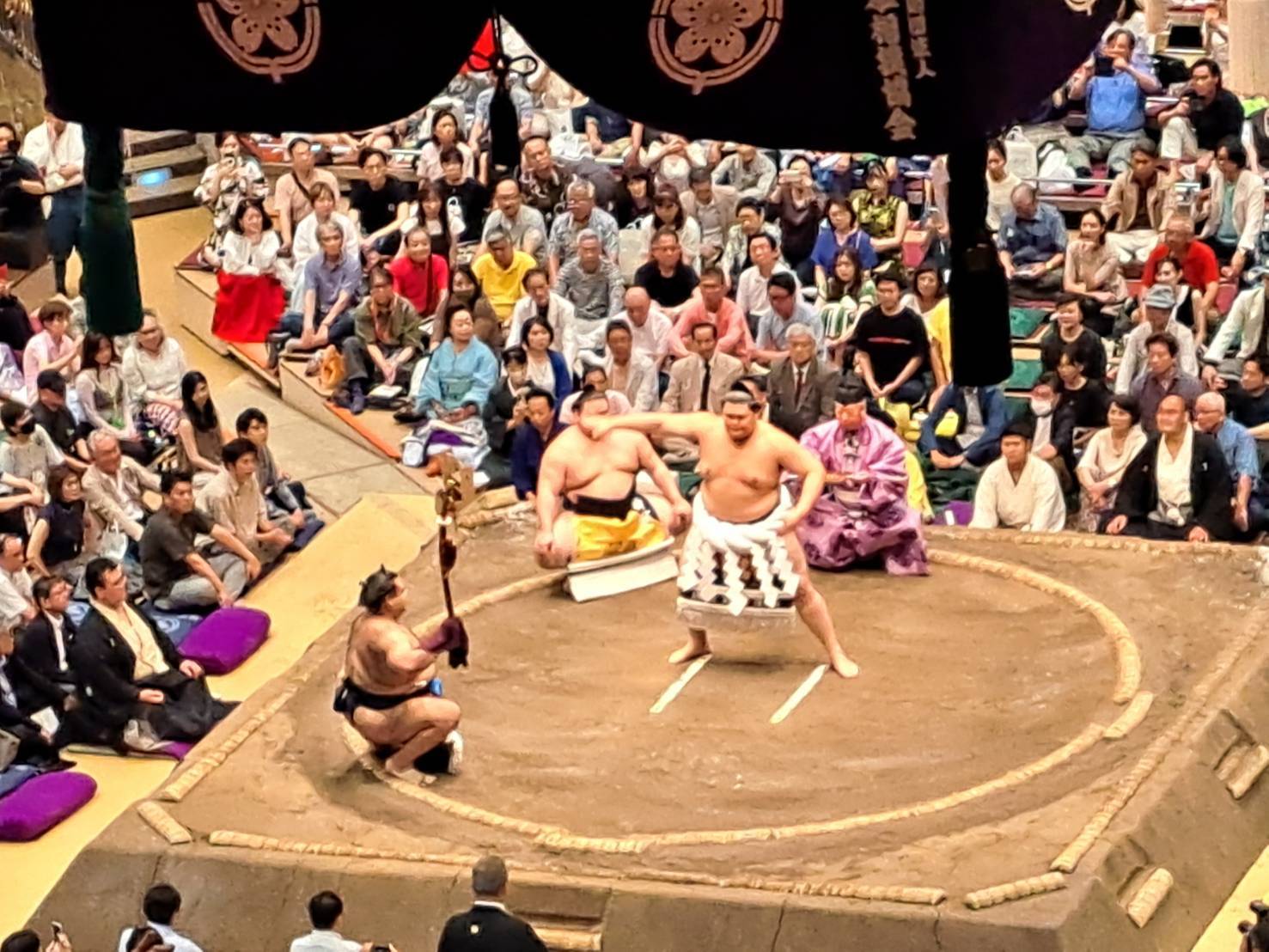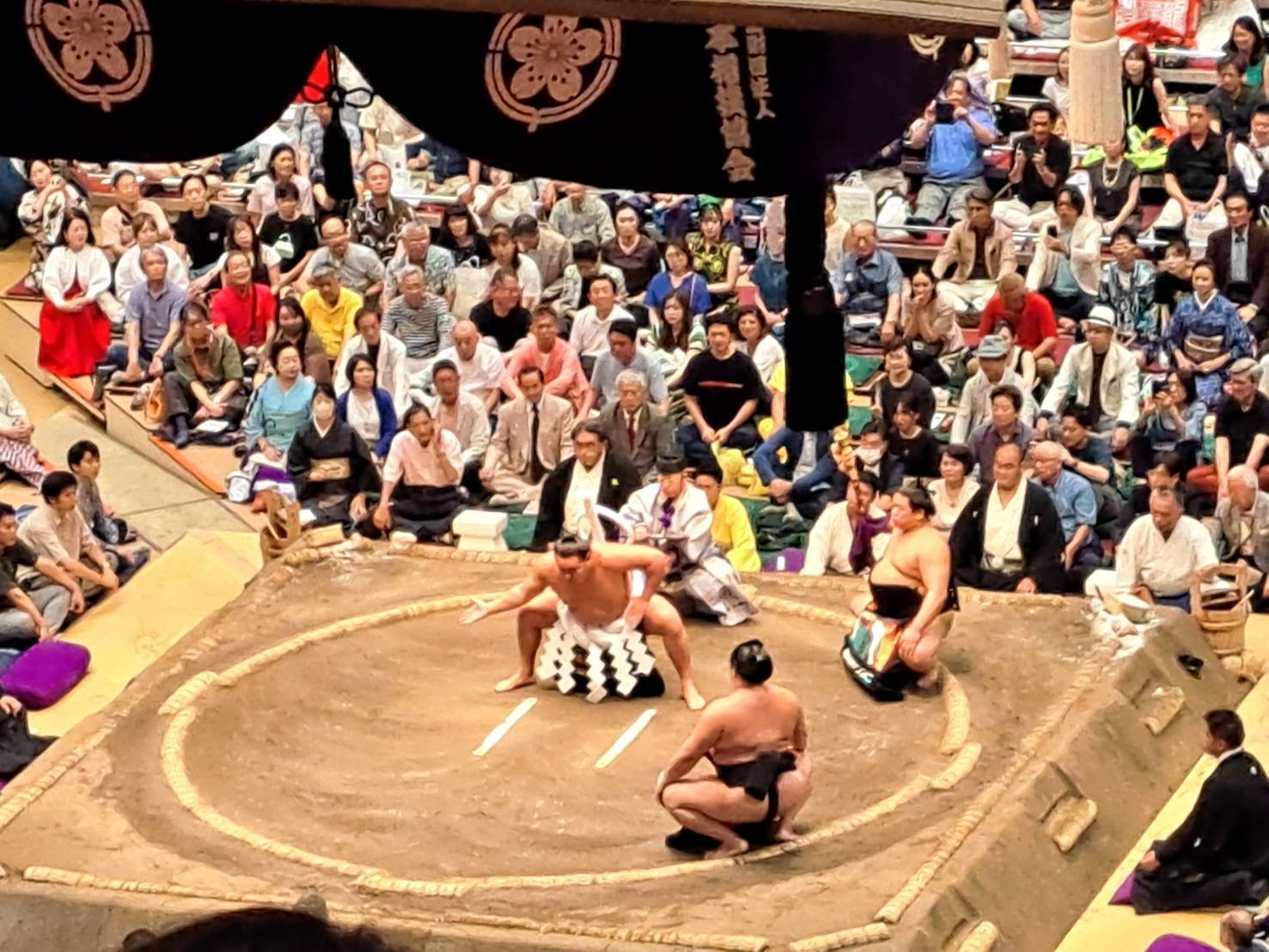 大相撲観戦前の懇親会でお腹いっぱいでお酒も入り、観戦中眠くなってしまうかと思われましたが、そのような心配も無用で目が離せず、白熱したあっという間の時間でした。