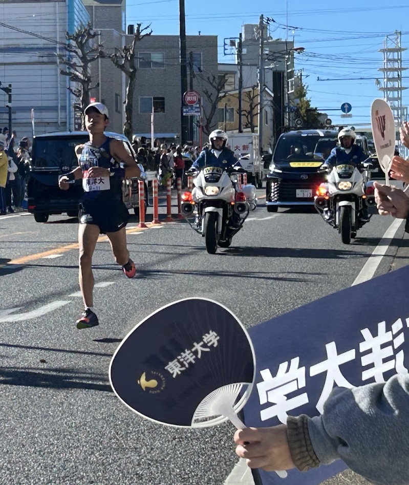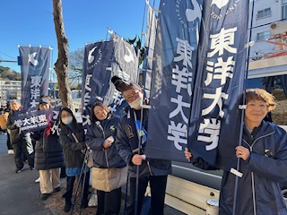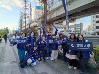 事前の案内をご覧いただき各応援場所に駆けつけてくれた会員の方々と鉄紺の幟旗や手持ち旗、うちわ等で力走する東洋大学の選手にエールを送りました。