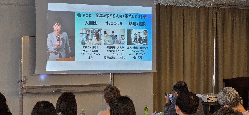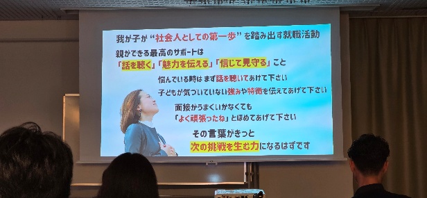 雨天の中開催された就職フォーラムですが欠席者は少なく、また学生さんの参加もあり保護者、学生共に関心の高いことを感じました。山岸講師の話は、ご本人もおっしゃっていた通り講師からの一方通行の話にならず、参加者との対話を感じさせる進行で約3時間集中して聞けました。参考になったことはたくさんあり、その中で印象に残ったことは2点ありました。
