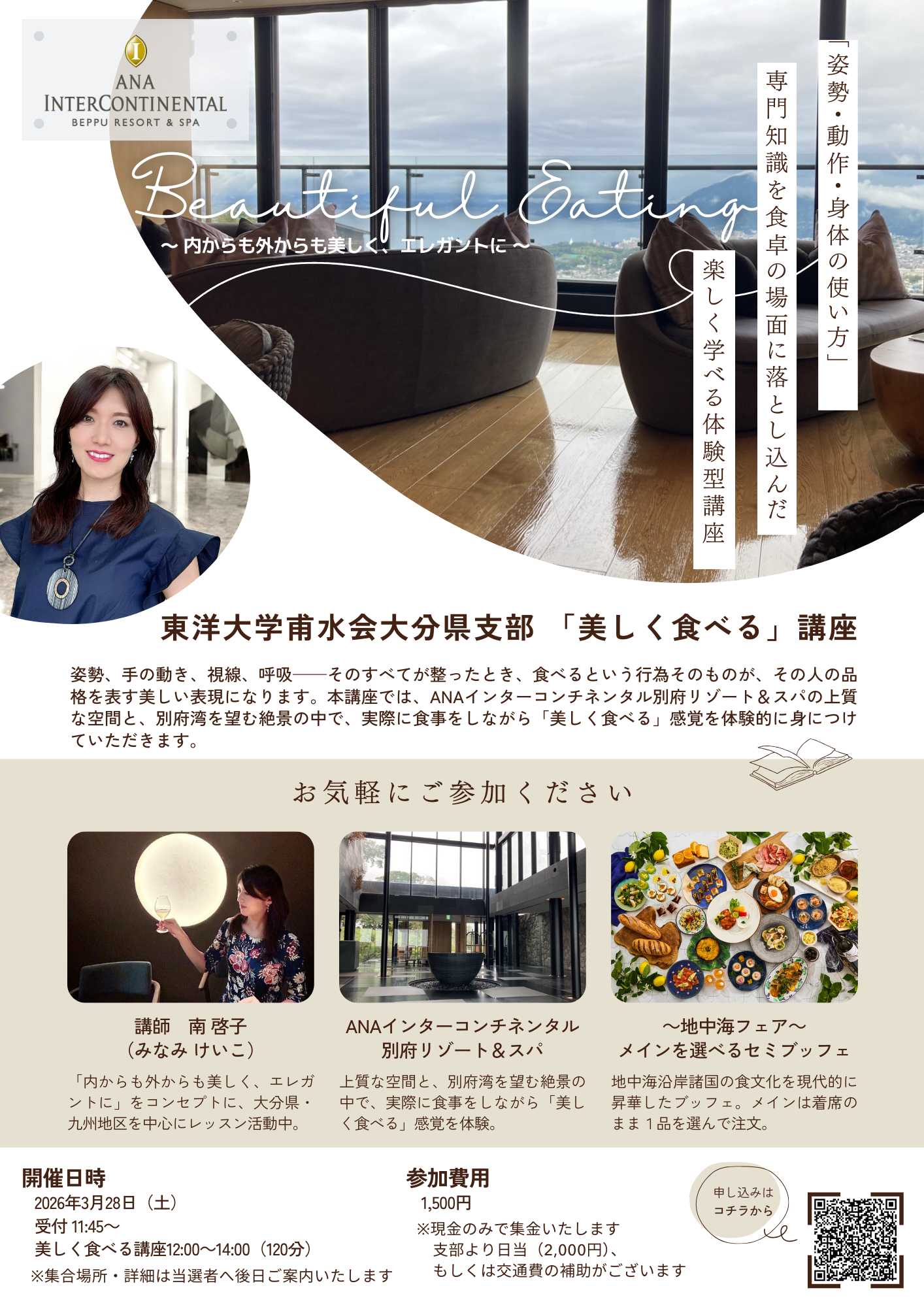 今回は、ANAインターコンチネンタル別府リゾート&スパ「エレメンツ」にて、ランチセミビュッフェを体験しながら学ぶ体験型講座「美しく食べる講座」を開催いたします。
